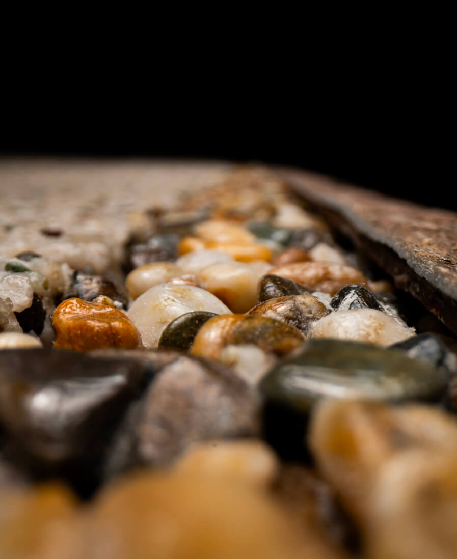 Materials evolve, settle, and prepare to become surfaces. Liquid resin flows with energy, slowly merging with minerals, forming a seamless bond.