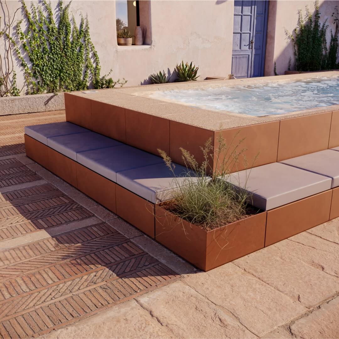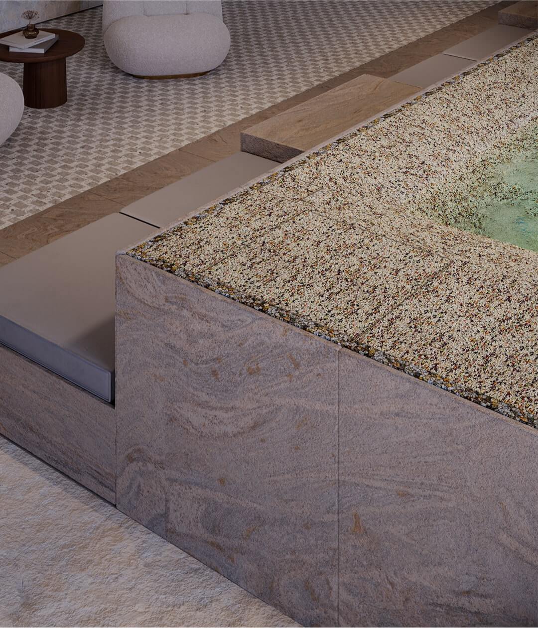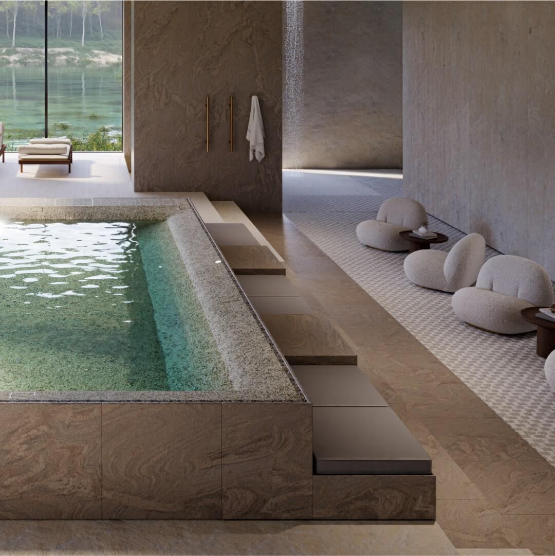 ICONIA, la minipiscina dove natura e design si fondono in armonia. I rivestimenti organici e la modularità delle forme ti offrono la libertà di plasmare uno spazio fluido.